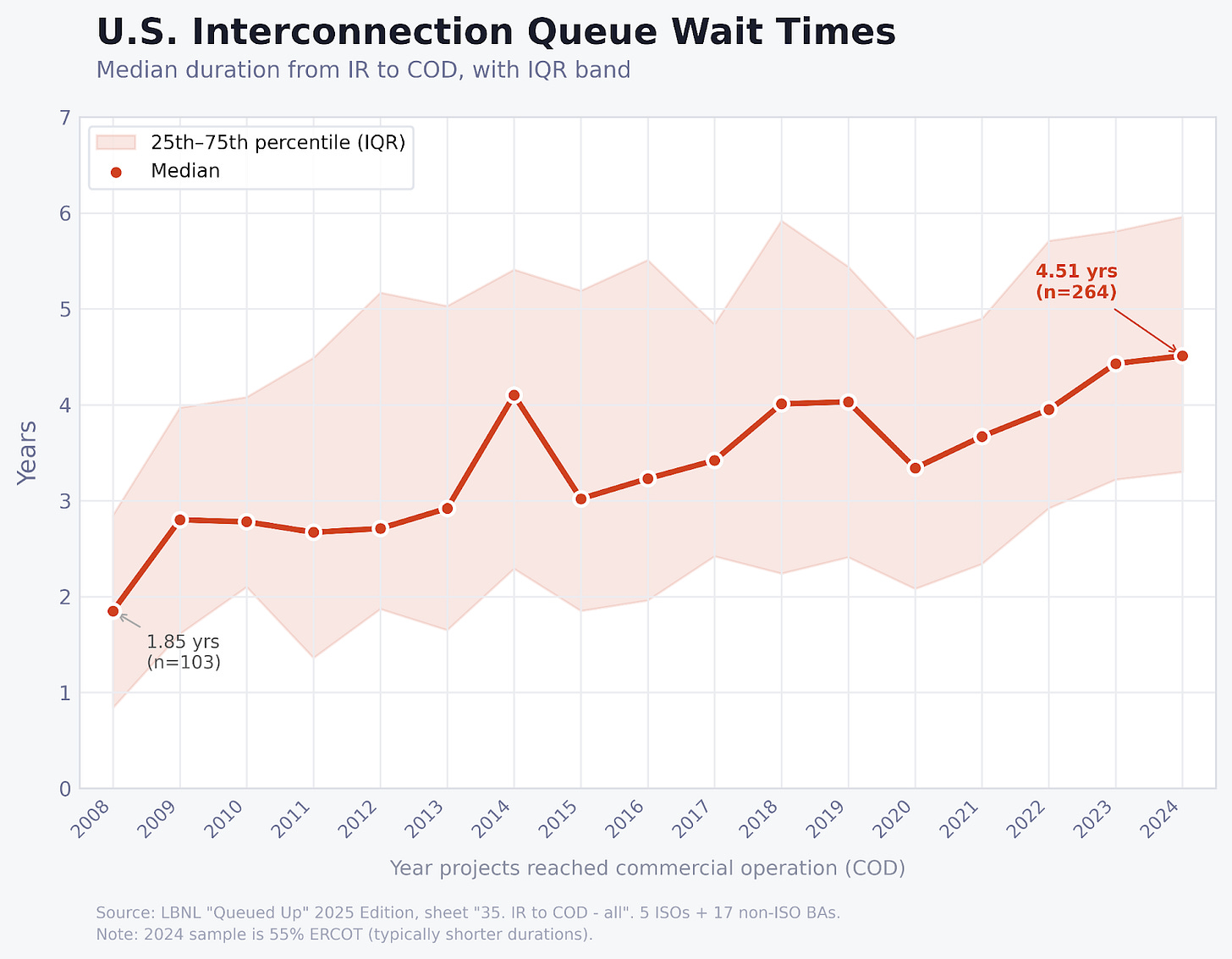 Chart of the Week: Energy demand has soared and the wait in the interconnection queue keeps getting longer. In 2008, a new project typically had to wait less than two years to get connected. But by 2024, it was over 4.5 years.